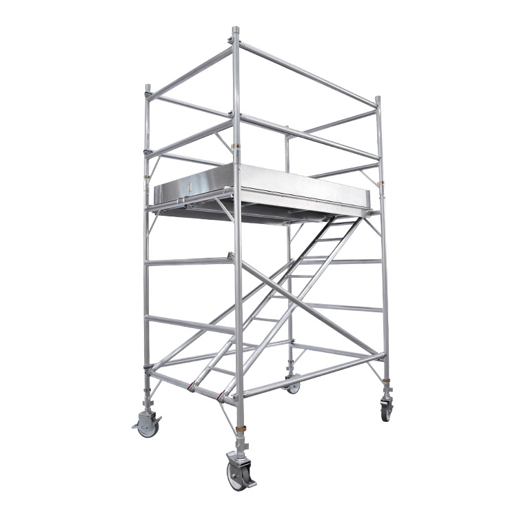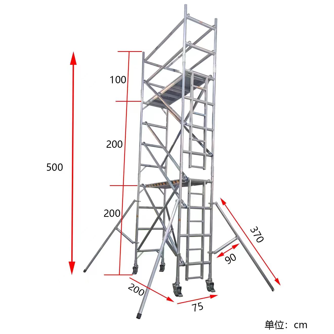 铝合金脚手架,主要型材为6061-T6和6082-T6,等,常规尺寸为2m*1.35m宽*2m高,一层高度为2m,可以根据不同高度而叠层组织使用,宽度,高度等可订制,配件:防滑舞台踏板,脚轮,斜撑脚,攀爬梯等为选配