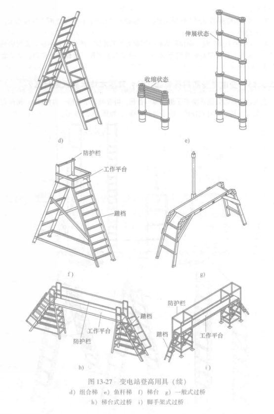 变电站登高用具包括梯子(抱杆梯、直梯、折叠梯、组合梯、鱼杆梯)、梯台和过桥,脚手架式过桥)