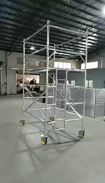 铝合金脚手架,主要型材为6061-T6和6082-T6,等,常规尺寸为2m*1.35m宽*2m高,一层高度为2m,可以根据不同高度而叠层组织使用,宽度,高度等可订制,配件:防滑舞台踏板,脚轮,斜撑脚,攀爬梯等为选配