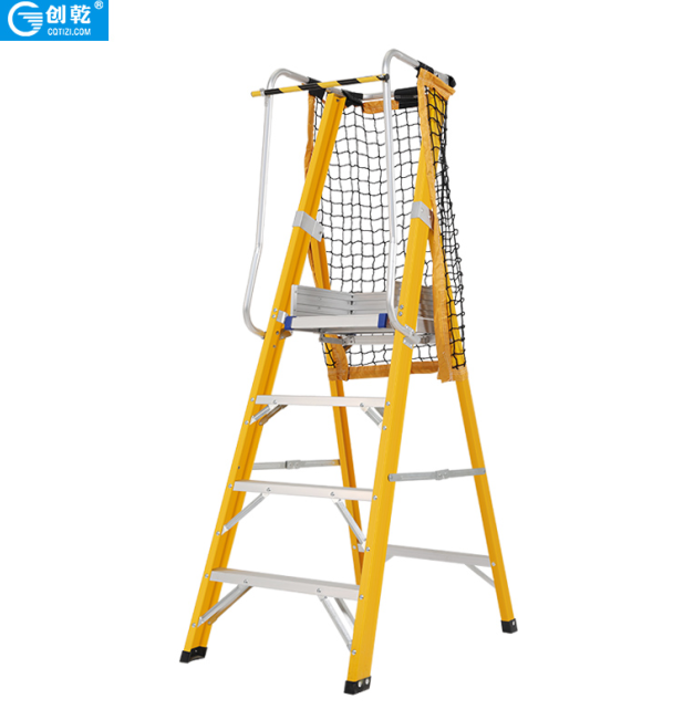 CQJF-6半绝缘铝梯,这款梯子是由绝缘玻璃钢纤维材料加铝合金踏板组合而成的,最上面一层踏板可以装安全网和梯脚板(可根据客户的需要加不加),而且还装有扶手,一切都是为了客户的安全。