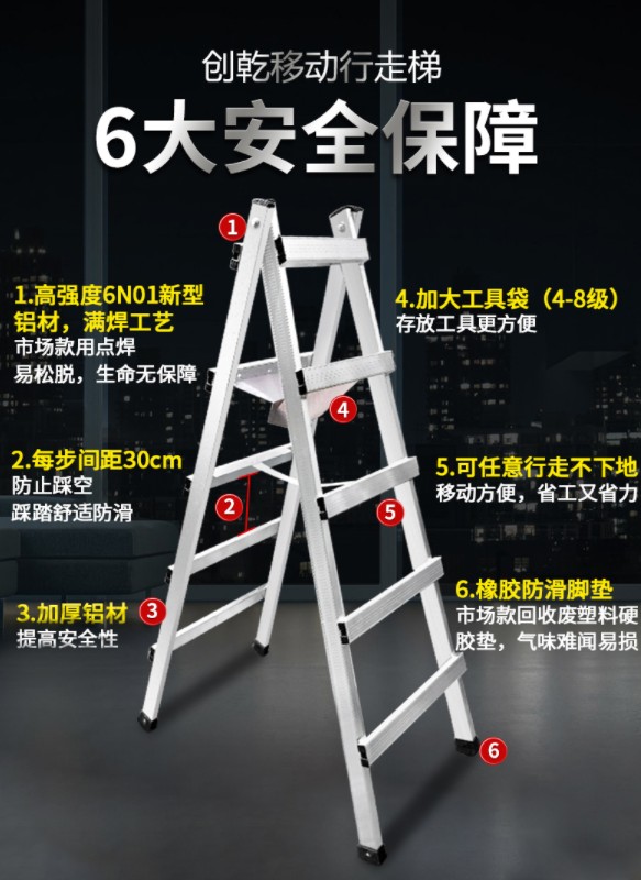 行走人字梯用的都是加厚进口航空铝材,高强度6N01新型铝材,加大工具袋,任意行瞳不下地,方便又省力。