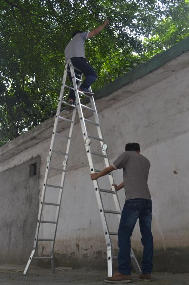 操作中:梯子搬运过程中记得戴手套,以免被划伤,在登高使用过程中,必须有人扶着,用脚顶住梯脚部位,在登高使用工作人员下来之前不得离开。