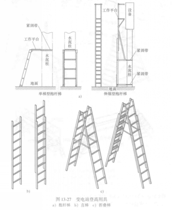 变电站登高用具包括梯子(抱杆梯、直梯、折叠梯、组合梯、鱼杆梯)、梯台和过桥,脚手架式过桥)