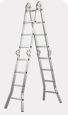 多用梯:可以在人字梯和直梯间切换,可以做很高,收起来约相当于同样高度伸展梯一半长度,注意,操作不当容易夹手。